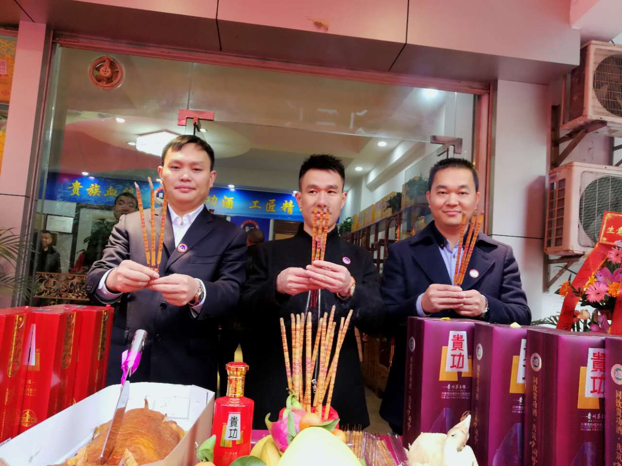2018年01月31日清晨,贵功酒东莞分公司黄江办事处成立暨品酒会迎来重要时刻——烧香拜神仪式,这是新店开业最必不可少的,拜神的寓意是:祭拜神灵,庇佑生意兴隆、财源广进。整个会场充斥着喜庆与祝福,被红色笼罩的茅台镇贵功酒熠熠生辉,每个贵功家人的脸上溢满了幸福。